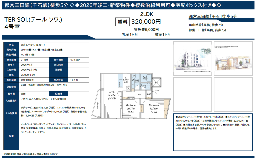 【スタッフからの一言】 文京区千石エリアで、これだけ広いリビングを持つ新築物件は非常に希少です。 最上階(4階)の角部屋につき、陽当たりや通風も良好。 定期借家5年という期間設定もあり、落ち着いて長く住まいたいファミリーにぜひおすすめしたい一部屋です。